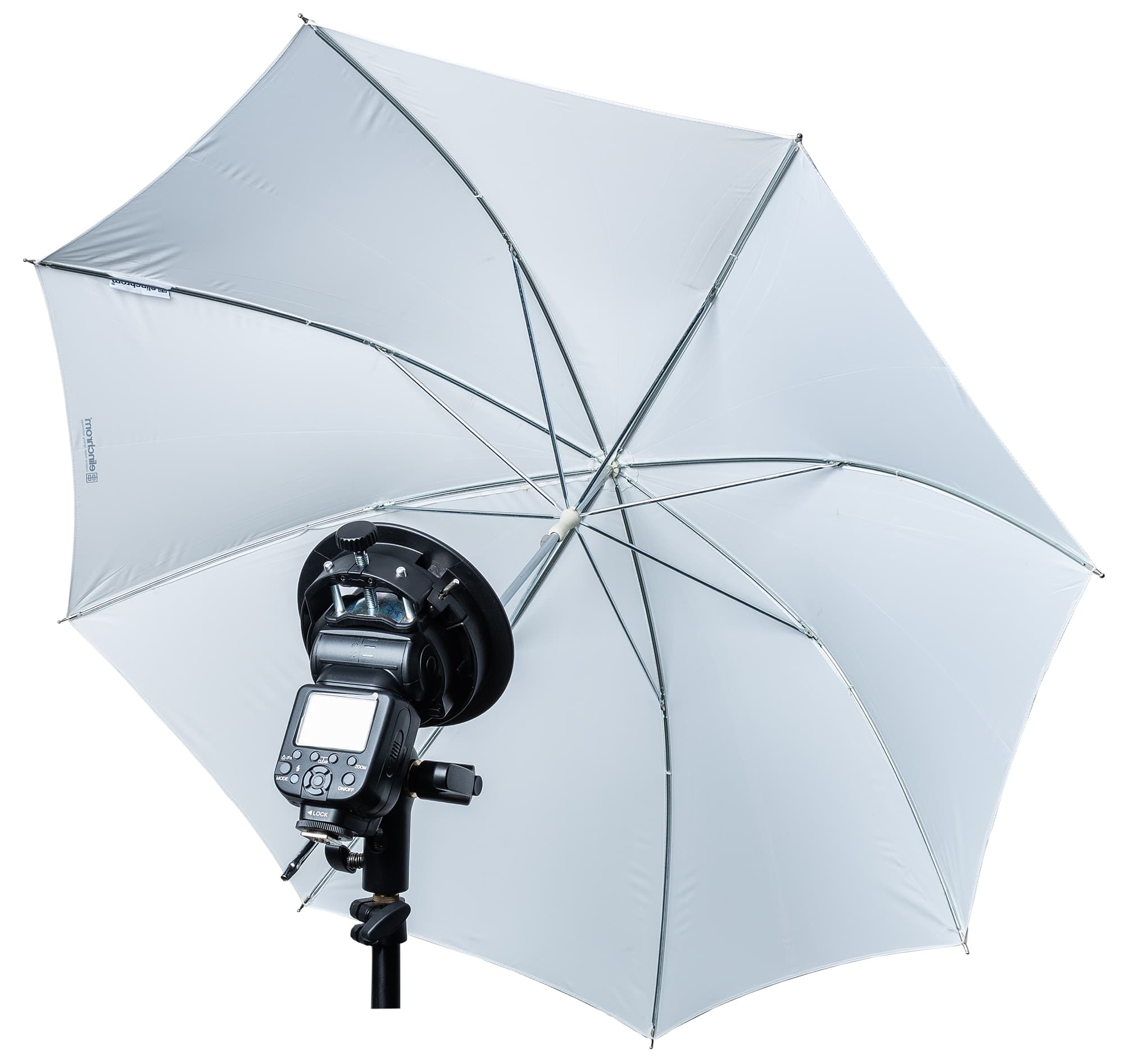 The shoot-through or translucent umbrella is economical and flexible. They can be used to soften tough direct flashes for portraits or spread out light for space interiors.